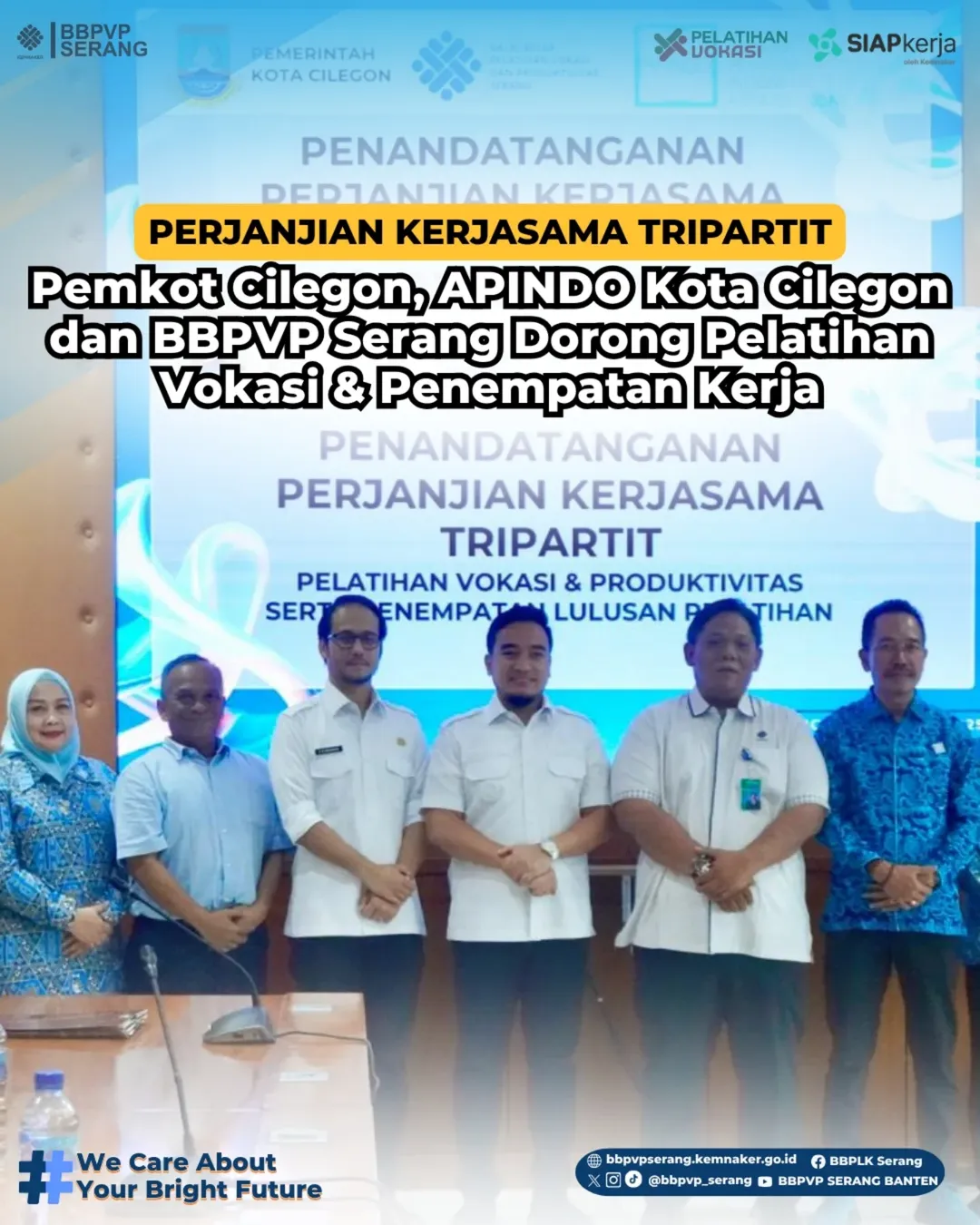 Telah dilaksanakan penandatanganan Perjanjian Kerja Sama Tripartit antara Pemerintah Kota Cilegon, APINDO Kota Cilegon dan BBPVP Serang. Kerja sama ini mencakup penyelenggaraan Pelatihan Vokasi dan Produktivitas serta penempatan lulusan pelatihan, dengan tujuan mempersiapkan tenaga kerja yang lebih kompeten dan siap bersaing sesuai kebutuhan industri. Perjanjian ini menjadi langkah strategis sebagai landasan bersama dalam meningkatkan kompetensi sumber daya manusia, sejalan dengan program prioritas Kementerian Ketenagakerjaan serta Rencana Pembangunan Jangka Menengah Daerah (RPJMD) Kota Cilegon 2025–2029. Melalui sinergi ini, diharapkan lahir tenaga kerja yang kompetitif, produktif, dan berdaya saing global, sekaligus memberikan kontribusi nyata bagi pertumbuhan ekonomi daerah.
